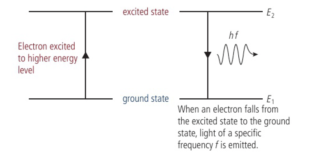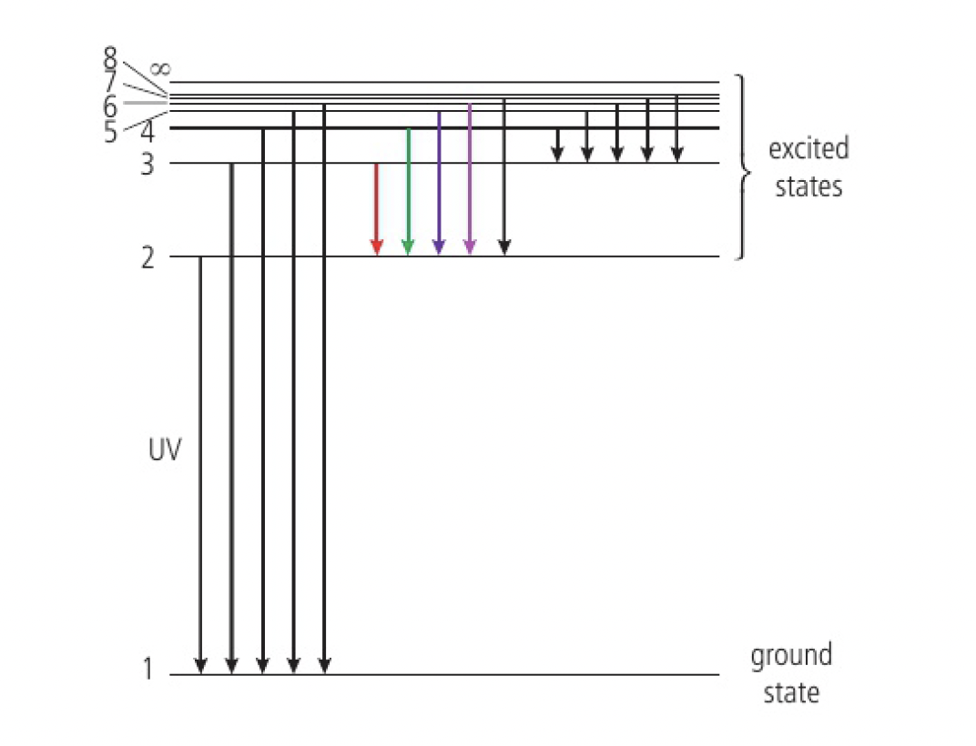 Structure 1.3.1 - Emission spectra are produced by atoms emitting photons when electrons in excited states return to lower energy levels.
