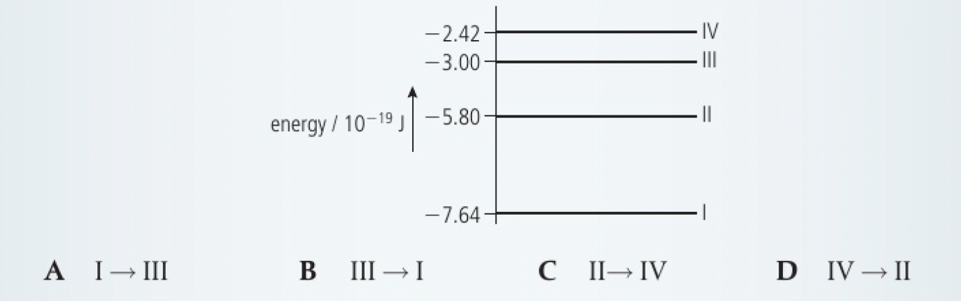 Some energy levels of the helium atom are shown. The energies of the levels are given in joules. Identify the transition that produces the line at 588 nm.
