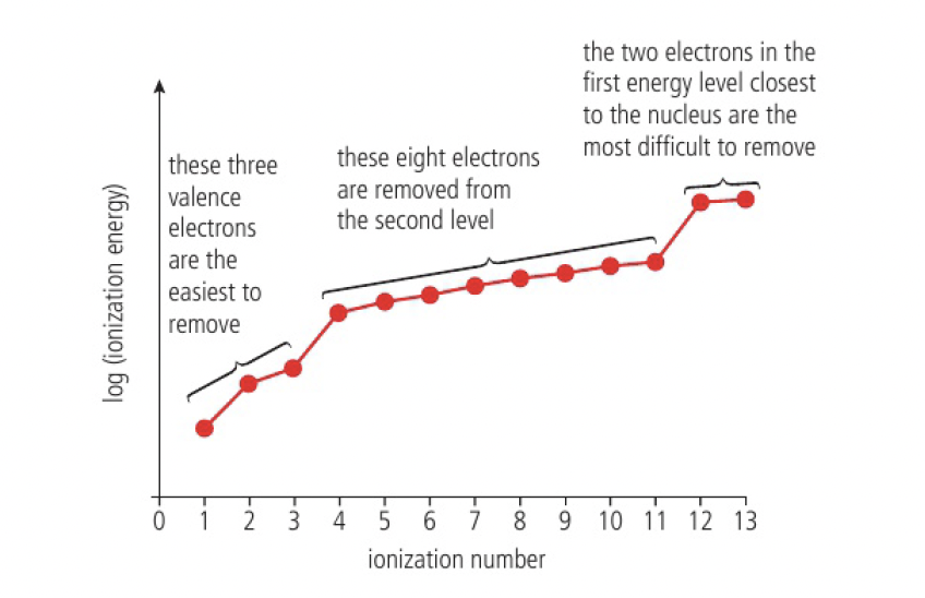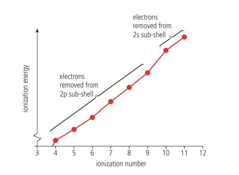 - the jump between the 9th and 10th ionisation energy shows that the 10th and 11th electron is more difficult to remove than would be expected from the pattern of previous electrons
