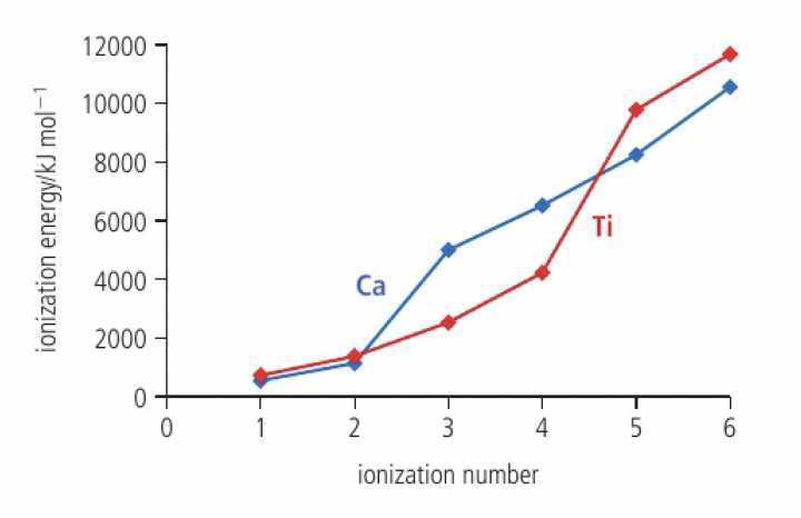 however, for titanium, the increase in successive energies is more gradual as the 3d and 4s orbitals are close in energy (and so follows)