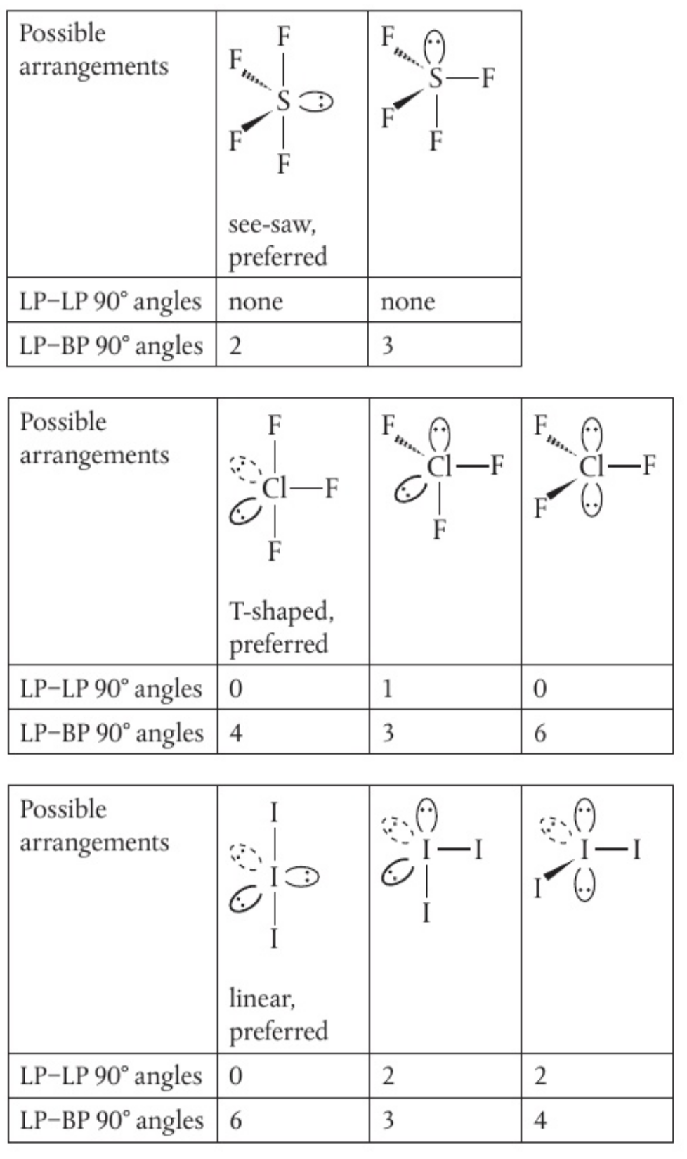 angles followed by the lowest number of 90 angles between lone pairs and bonding pairs. can you use this approach to show why we observe see-saw, T-shaped, and linear geometries for