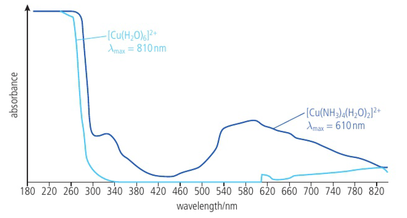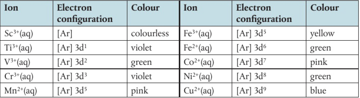 Structure 3.1.10 - transition element complexes are coloured due to the absorption of light when an electron is promoted between the orbitals in the split sublevels. the colour absorbed is complementary to the colour observed