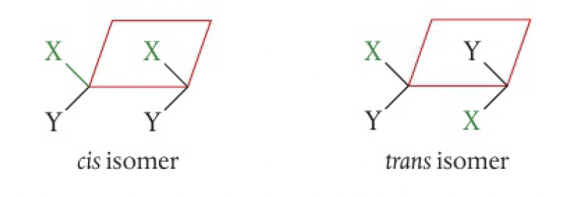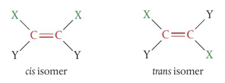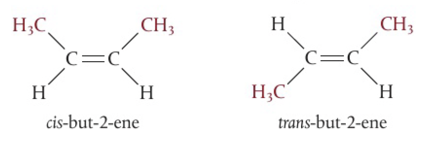when the molecule contains two or more different groups attached to the double bonded carbons, they can be arranged to give two isomers. the simplest, involving 2 different substituents, form cis and trans isomers. the prefixes are given in italics before the name