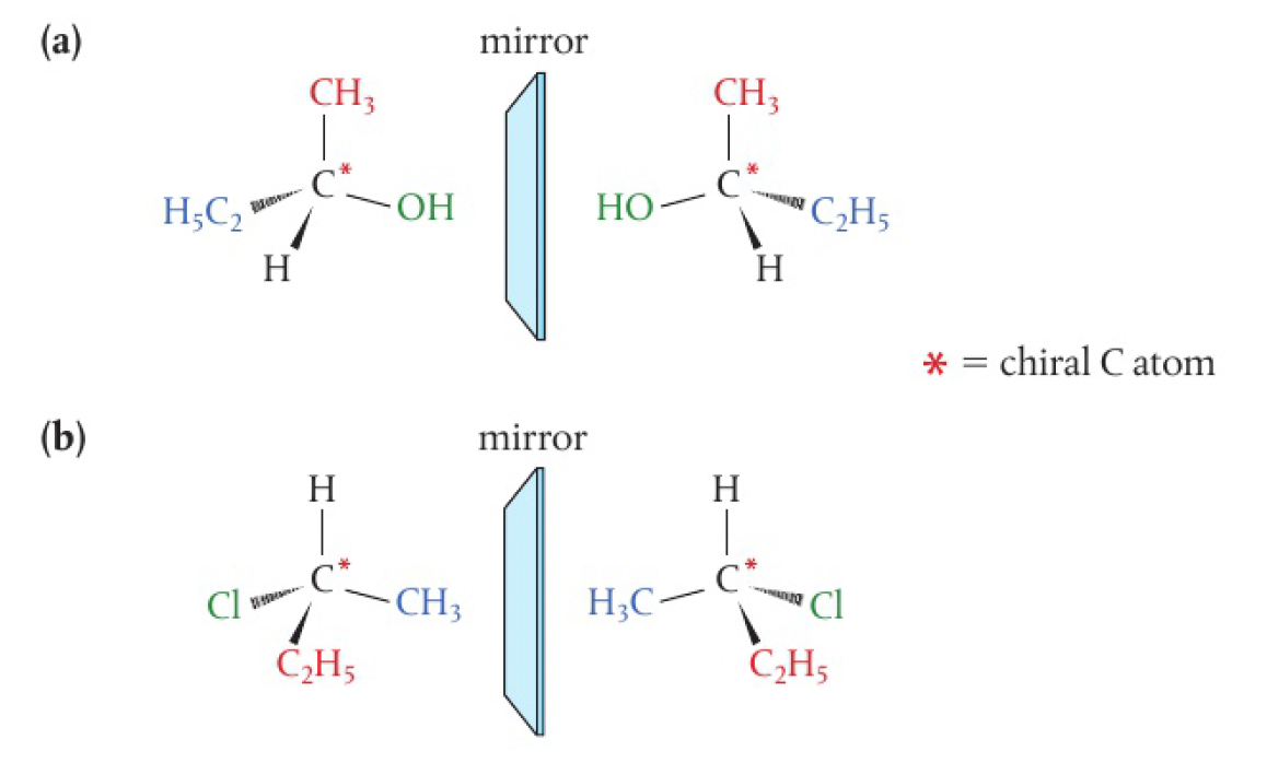 a carbon atom attached to ==four different atoms or groups== is known as chiral, asymmetric, or a stereocentre. the four groups, arranged tetrahedrally around the carbon atom with bond angles of 109.5