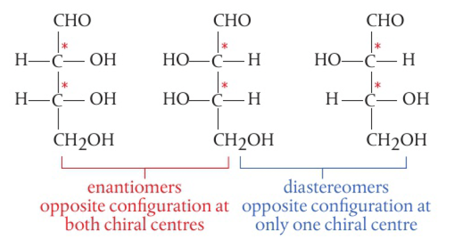 enantiomers have opposite configurations at each chiral centre. some molecules have different configurations at one or more, but not all, chiral centres, known as diastereomers and are not mirror images of each other. eg. glucose and galactose. common sugars are often diastereomers of each other.