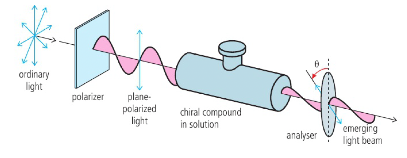a solution of optical isomers rotates plane-polarised light when a beam of it is passed through, which can be measured with a polarimeter