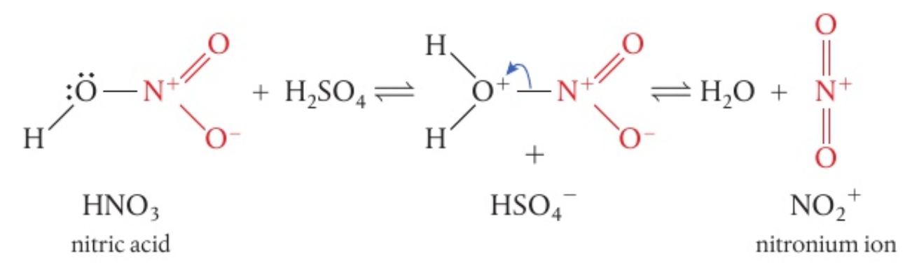 is a strong electrophile and attracts the electrons of the benzene ring to form the carbocation intermediate - loss of a proton from this intermediate leads to reformation of the arene ring in the product, appearing as a yellow oil